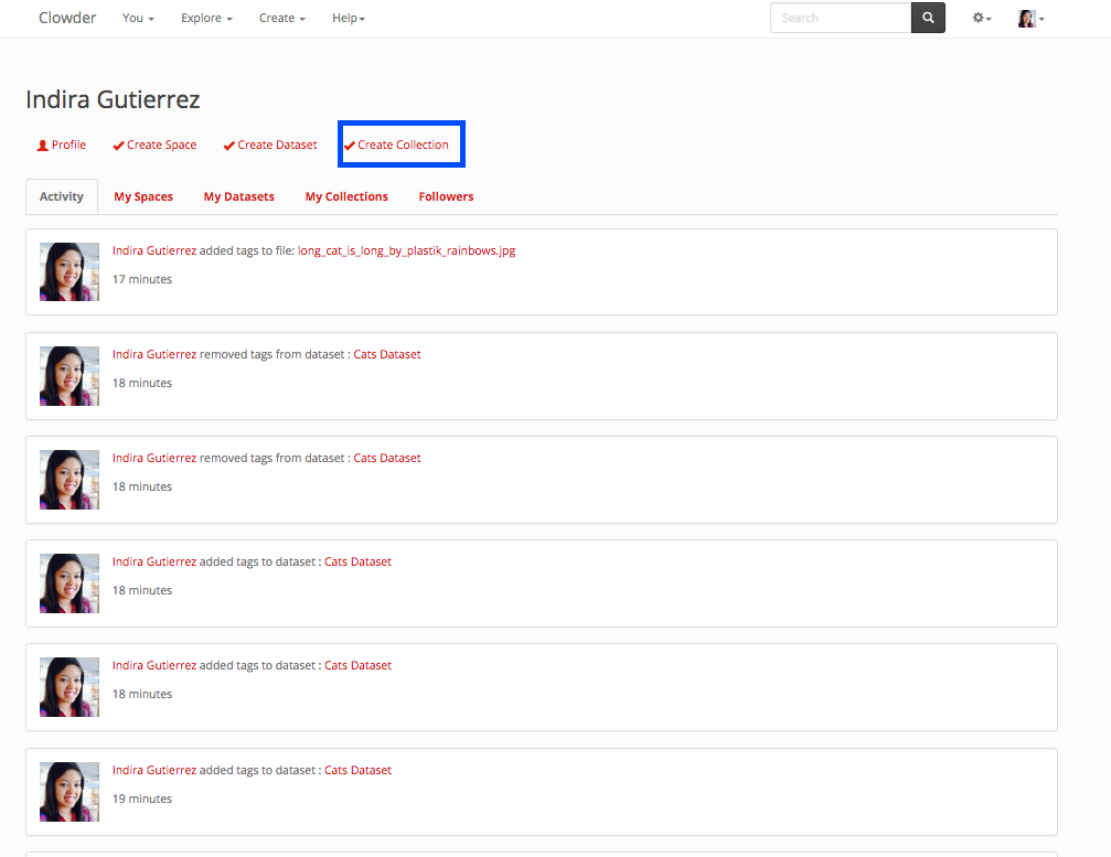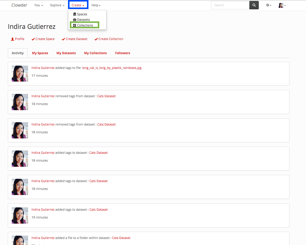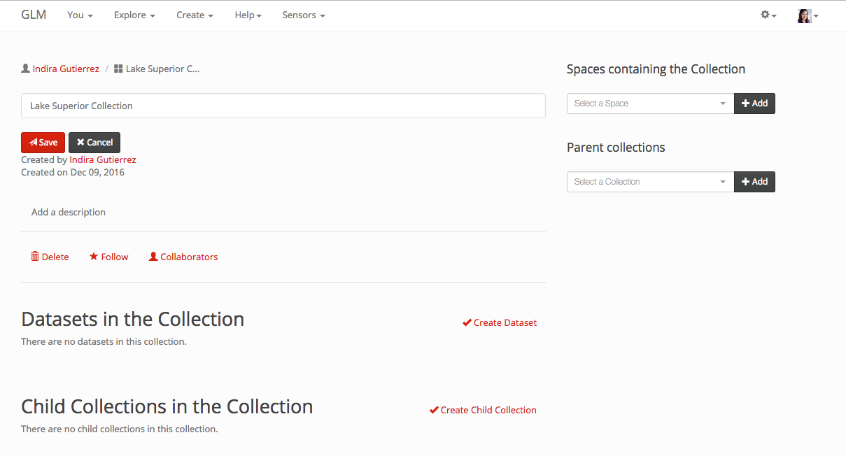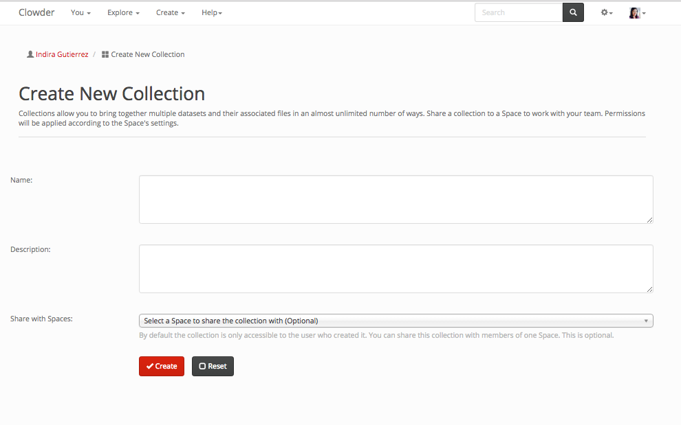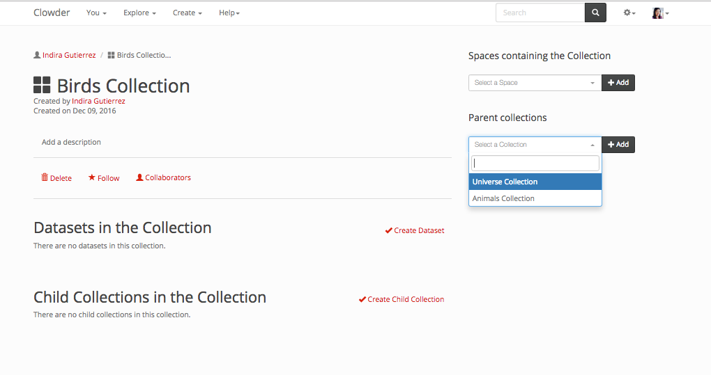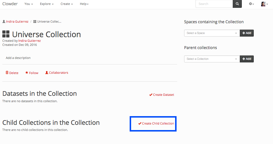Similarly as a dataset, a collection can be created from the home page, the top navigation page, within the collection list or within a space.