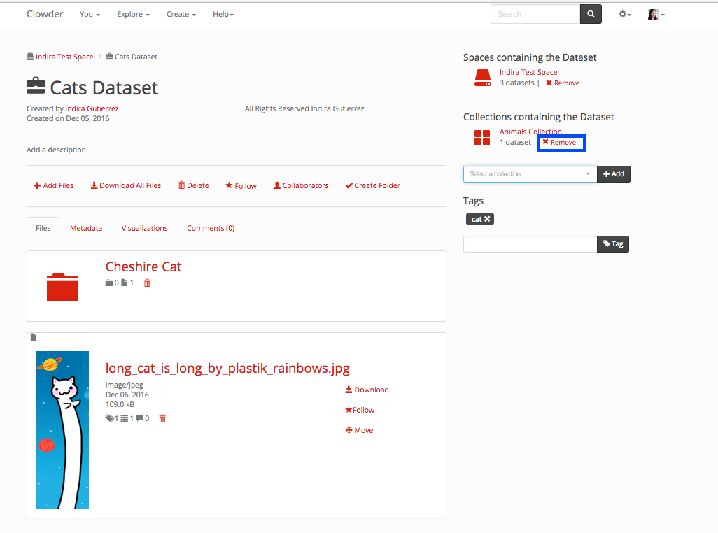 To remove a dataset from the dataset page, In the right navigation in the ‘Collections containing the dataset’ you can click on the remove button next to the collection you want to remove the dataset from. The remove link is highlighted in the next figure.