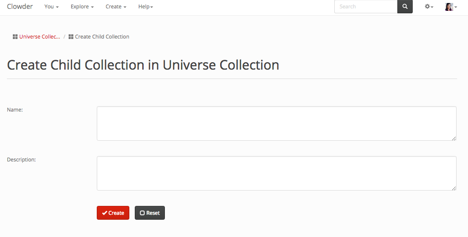 The Create Child Collection page looks as below. It is a little different than creating a collection page, because it cannot be added to a space directly. It will inherit the spaces from the parent collection. After adding a name and optional description you can click on the create button in the bottom.