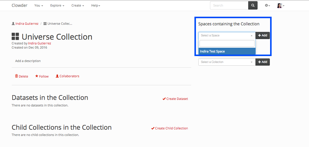 You can add an existing collection to a space by going to the collection page and clicking on the dropdown in the ‘Spaces containing the Collection’ section, selecting the space you want to add the collection to and then clicking on the Add button next to it.