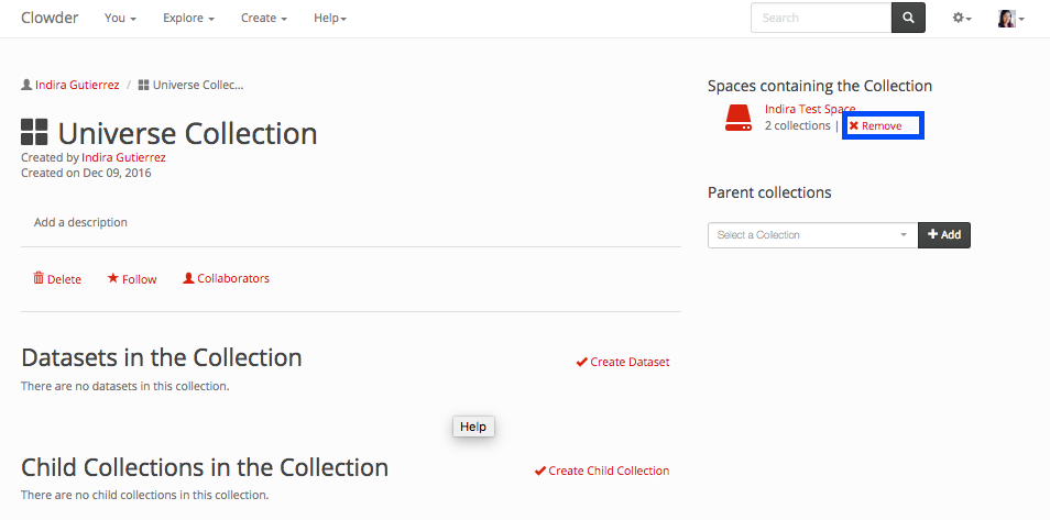 A collection can be removed from a space within the collection page or within the space page. To remove the collection within the collection page, click the ‘Remove’ button next to the space you want to remove it from. This is highlighted in the next image with a blue box.