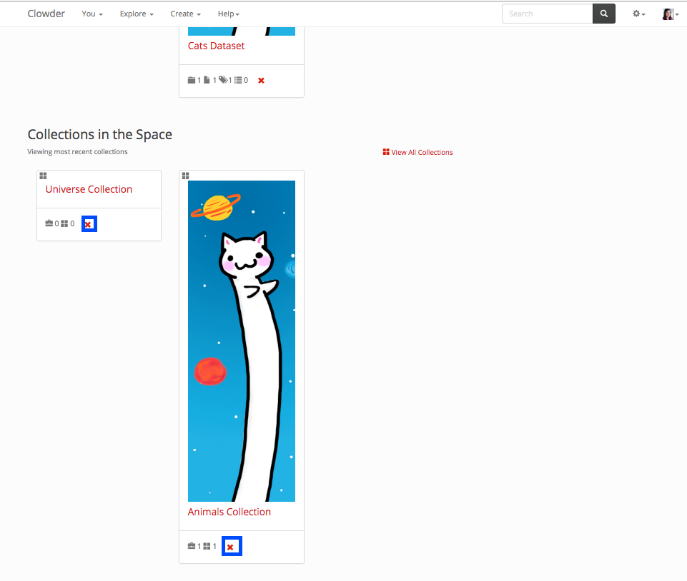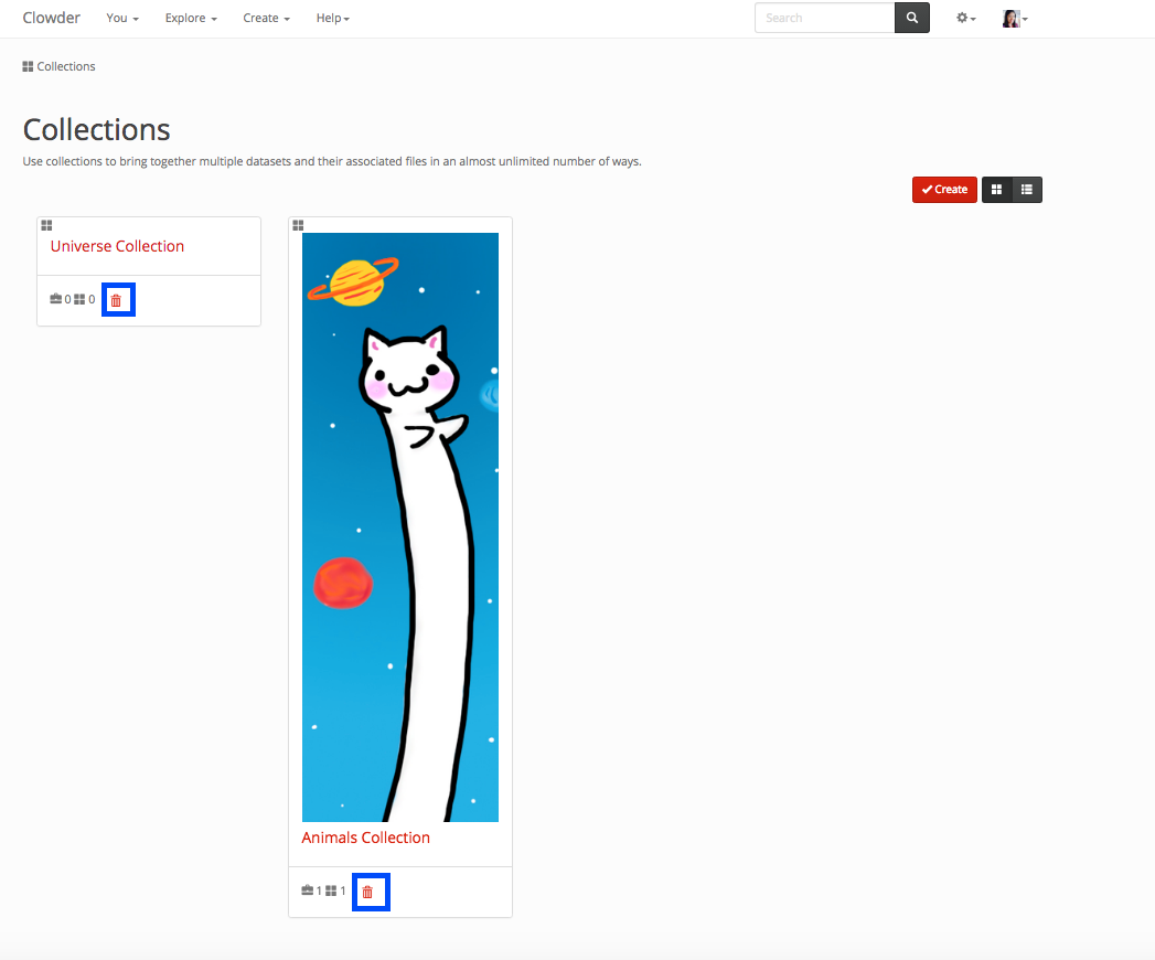 To delete a collection from the collection list page, click on the trash button within the tiles. They are highlighted below in blue boxes.