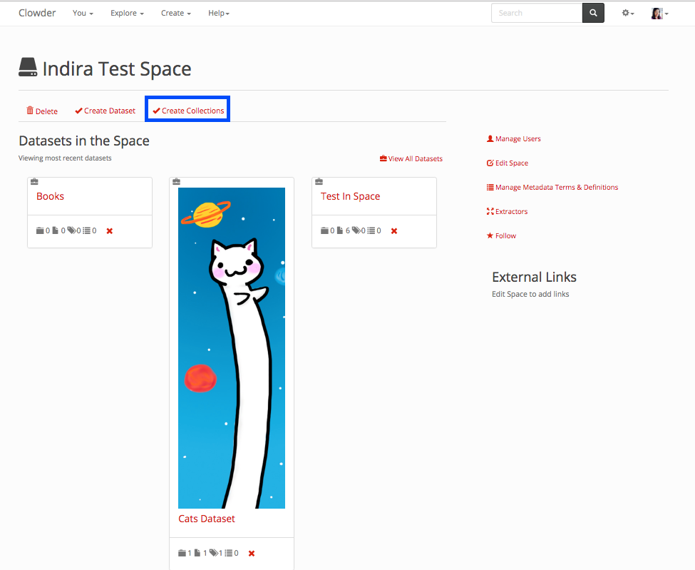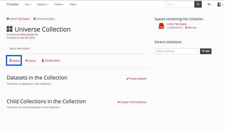 If you want to completely delete a collection from Clowder, you can do so within the collection itself, on the collection list, or if you created the collection from the home page.