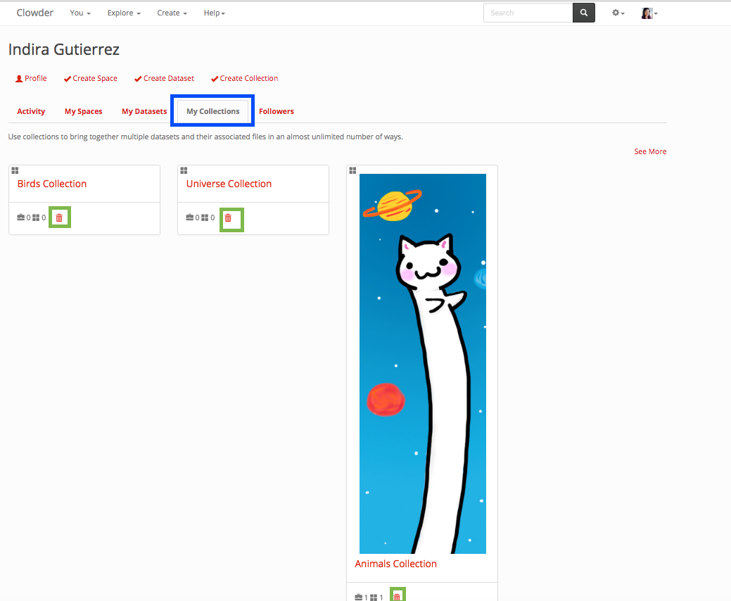 If you created a collection, you can delete them from your home page. Go into the ‘My Collections’ tab displayed below with a blue surrounding box. And then click on the trash can icon in the collection you want to delete, highlighted in green in the image below.