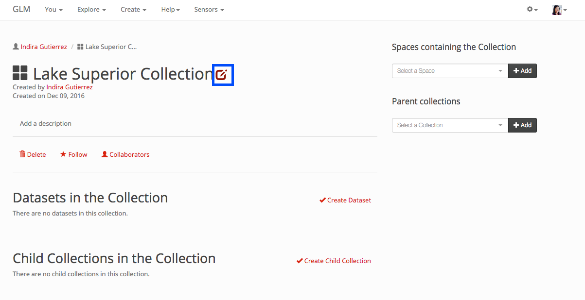 In a collection, you can edit the name and the description. In order to do so, hover over the collection name or description and an edit symbol will show up. The button that shows up is displayed within a blue box on the next image.