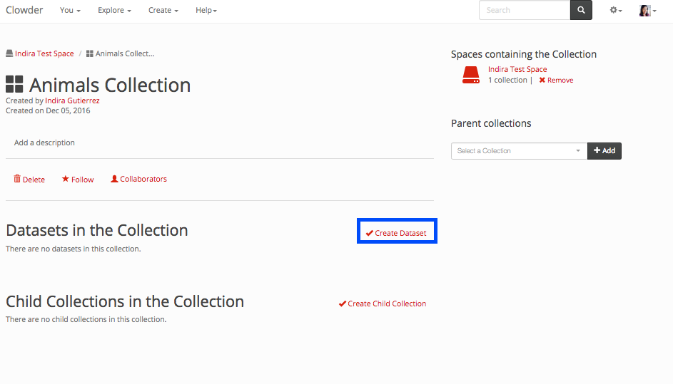 If you want to add a new dataset to a collection, you can create it within the collection page by clicking the create dataset button highlighted in the image below.