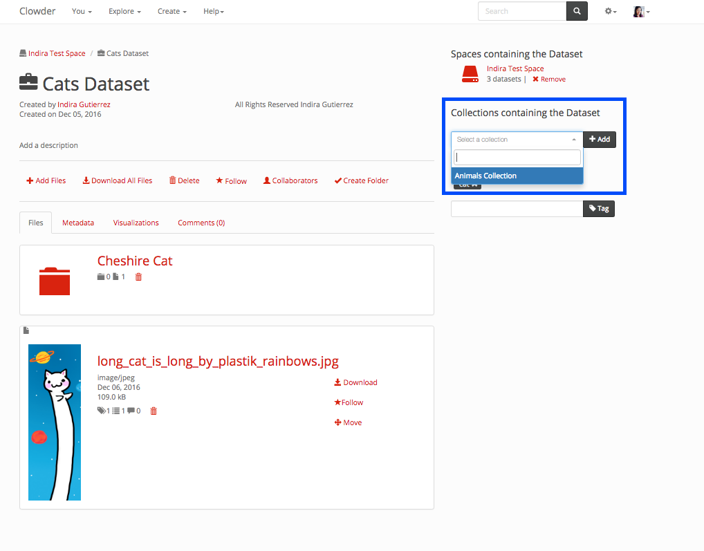 If you want to add an existing dataset to a collection, you need to go into the datasets page. In the right navigation there is a section called ‘Collections containing the dataset’ where a list of the collections that a dataset is part of will show up, if it is part of a collection. At the end, there is a dropdown that will show the collections you can add the dataset to. You can select one and click on the Add button. The section where you can add a dataset to a collection is highlighted below in a blue box.