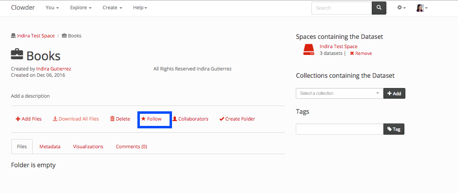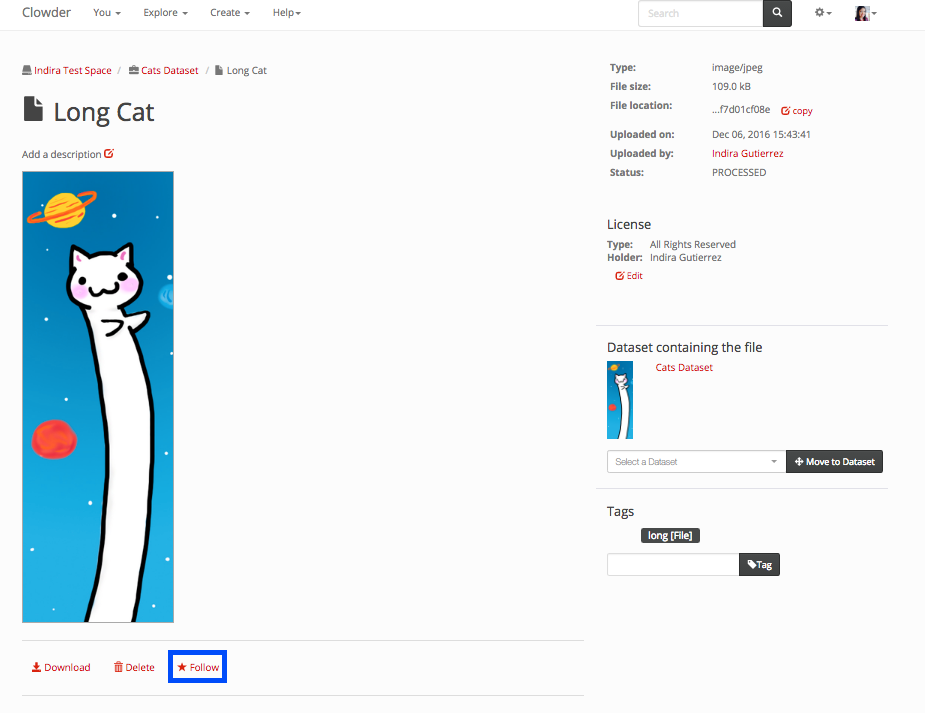 To follow a file within the file page click on the follow button displayed in blue in the next image.