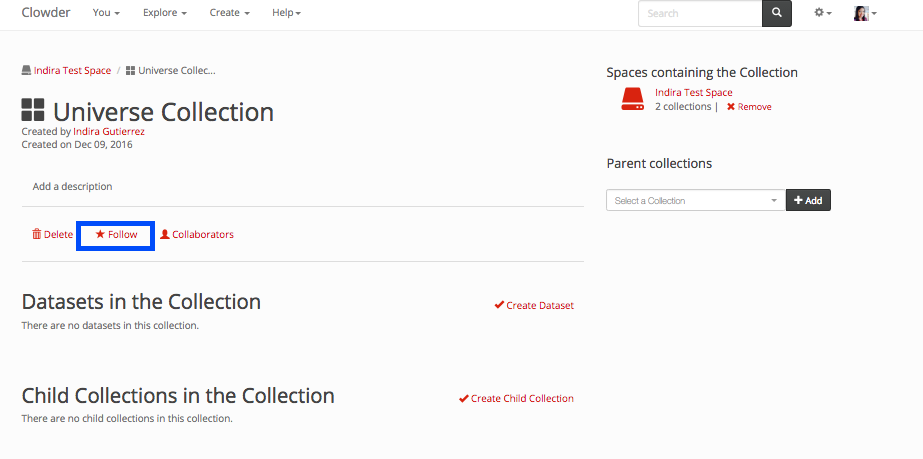 To follow a collection within a collection page click on the follow button displayed in blue in the next image.