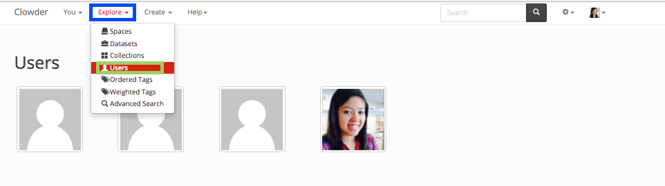 To follow a user, you can go into the listing page of users in by clicking on Explore in the top navigation as indicated in blue in the next image and then users as indicated by the green box.