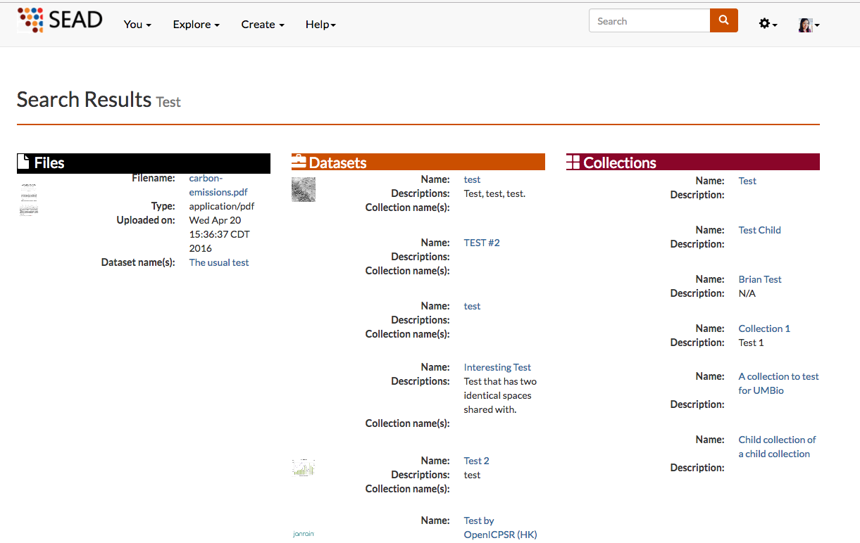 In Clowder, you can search datasets, collections and files by name and description. To do so, just input the string you want to look for in the search box on the top right. As indicated in the image below with a blue box and click on the search button next to it or click enter. The image below also shows a sample result of a search.